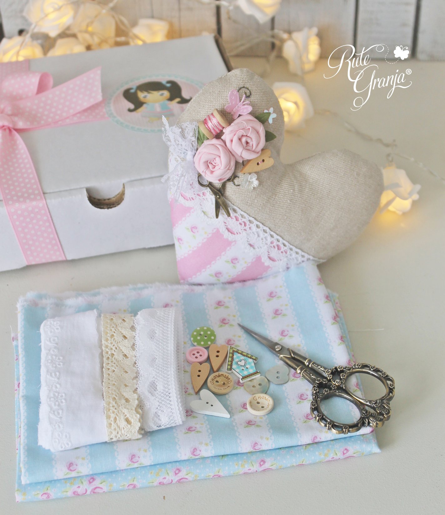 Caixinha temática com artigos(normalmente três tecidos com 25x150cm e botões) selecionados por mim para vocês, com um kit (passo a passo, molde e materiais) incluido...